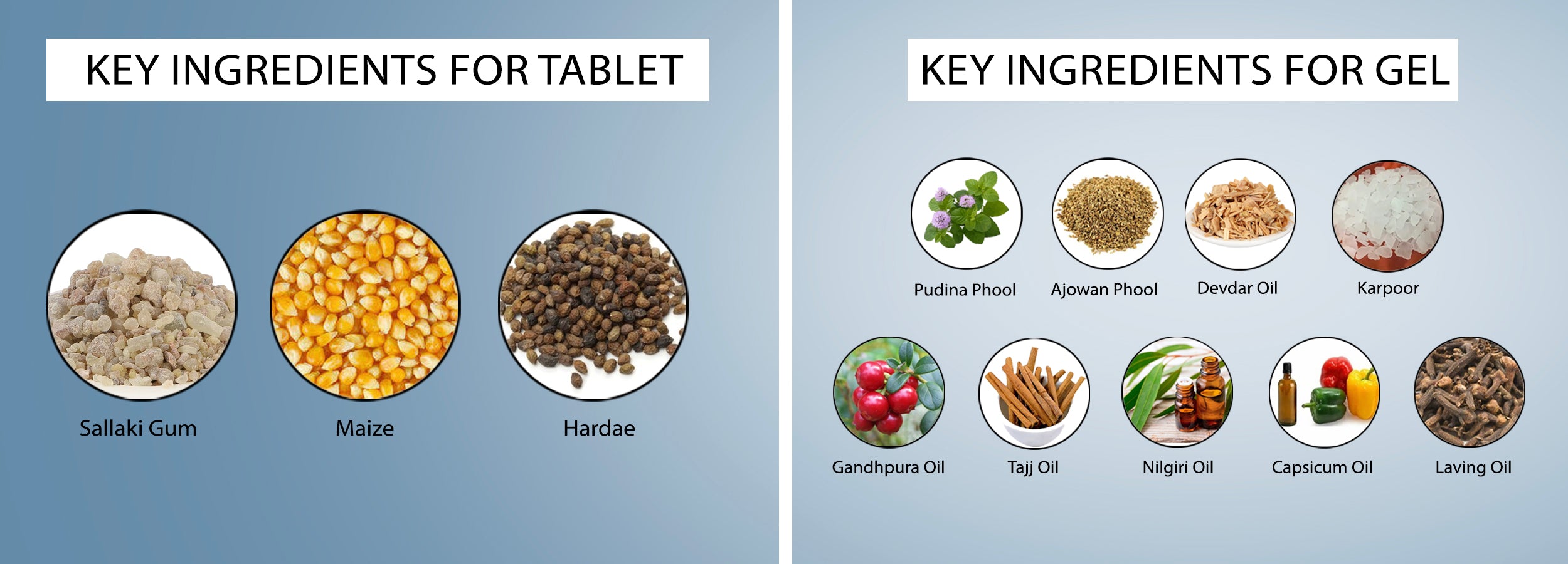 Ruamit Insta Gel: Gandhapura oil, Pudina ka phool, Ajmoda oil, Kapoor oil, Ajwain oil, Devdaru oil, Nilgiri oil, Lavang oil, Capsicum oil.